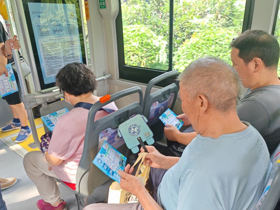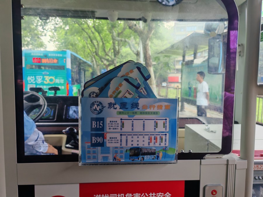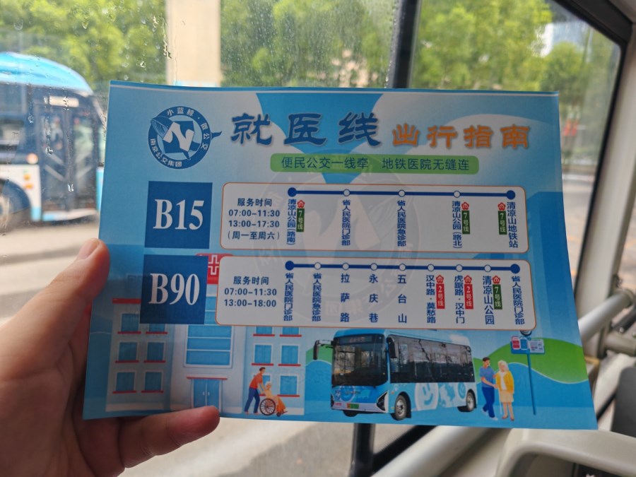 這份 “出行指南” 形式貼心,既有便于攜帶的宣傳單,還有夏日實(shí)用的定制小扇子,里面的內(nèi)容更是干貨滿滿。在線路信息上,B15 路和 B90 路的起始站、途經(jīng)站以及全程路線走向都標(biāo)注得清清楚楚。尤其值得一提的是,不同線路可換乘的地鐵站用醒目的顏色做了區(qū)分 —— 比如 B90 路的漢中路?莫愁路站、虎踞路?漢中門(mén)站能換乘地鐵 2 號(hào)線,清涼山公園站可換乘地鐵 7 號(hào)線;B15 路的清涼山公園站還特意標(biāo)明了路南、路北兩個(gè)站點(diǎn)的具體位置,就算是對(duì)南京路況不熟悉的外地患者,也能輕松看懂路線。不僅如此,出行指南背面還印著 “寧通行” App 的下載二維碼,幫助乘客精準(zhǔn)預(yù)測(cè)公交到站時(shí)間、實(shí)時(shí)掌握車(chē)輛位置,大大緩解了等車(chē)時(shí)的焦慮。