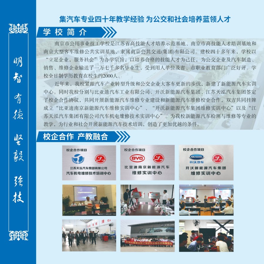 南京市公用事業(yè)技工學(xué)校是江蘇省高技能人才培養(yǎng)示范基地、南京市高技能人才培訓(xùn)基地和南京大型客車維修公共實訓(xùn)基地,舉辦單位是南京市城鄉(xiāng)建設(shè)委員會,隸屬南京公共交通(集團)有限公司管理。建校四十多年來,學(xué)校以“立足企業(yè),服務(wù)社會”為辦學(xué)宗旨,以培養(yǎng)合格的技能人才為己任,為公交企業(yè)及汽車制造、銷售、維修企業(yè)輸送了一萬七千多名畢業(yè)生,受到用人單位及省、市職業(yè)教育部門的廣泛好評。學(xué)校全日制學(xué)歷教育在校生約2000人。